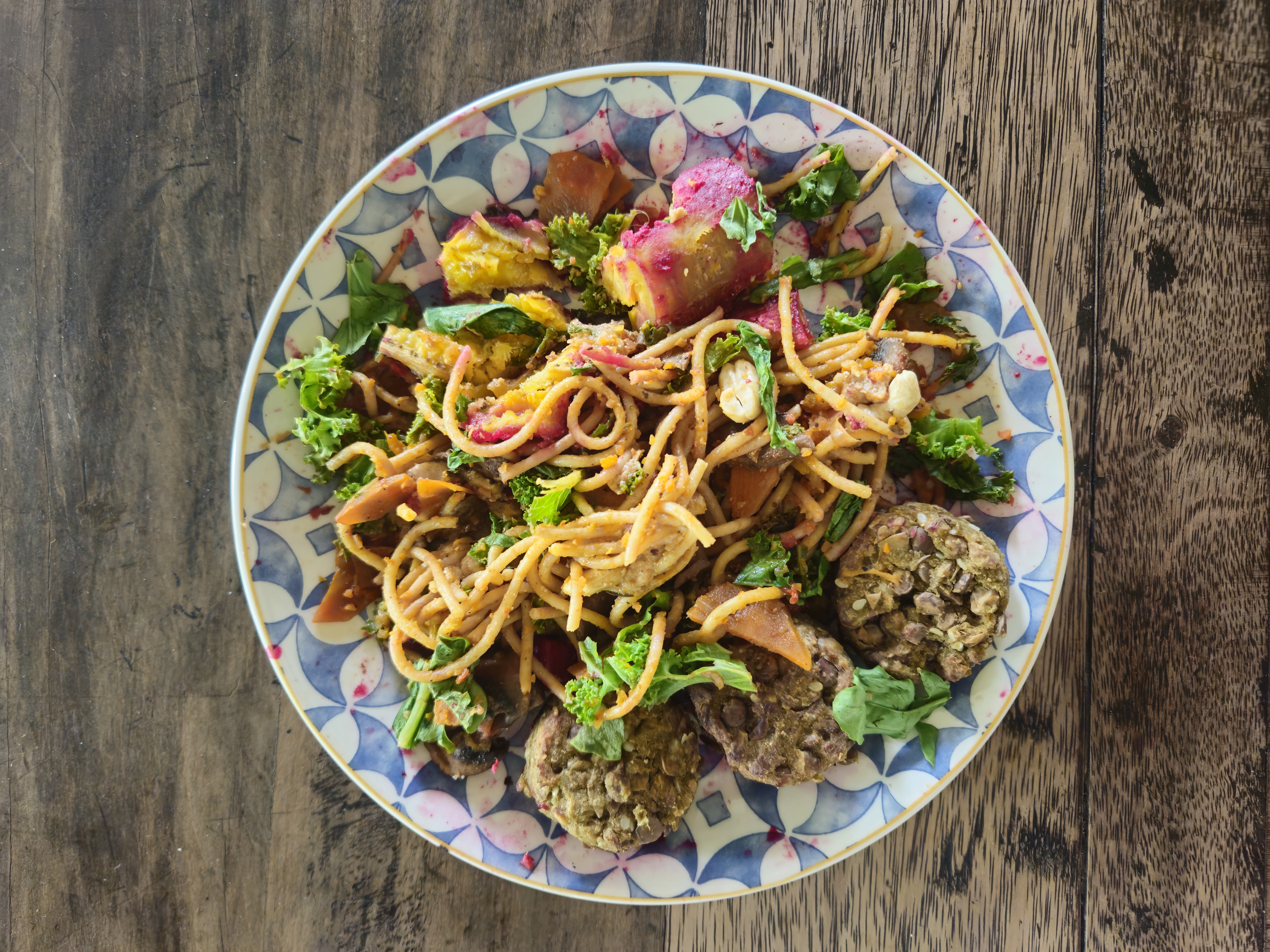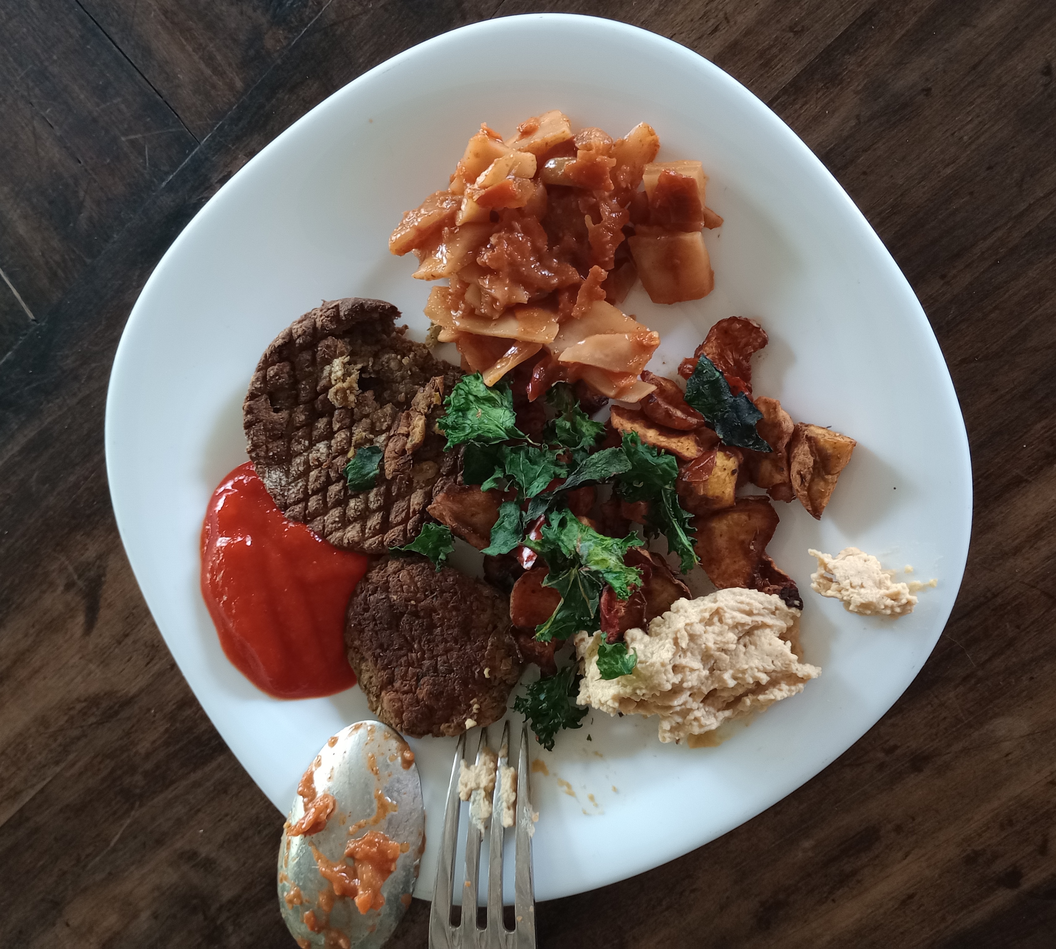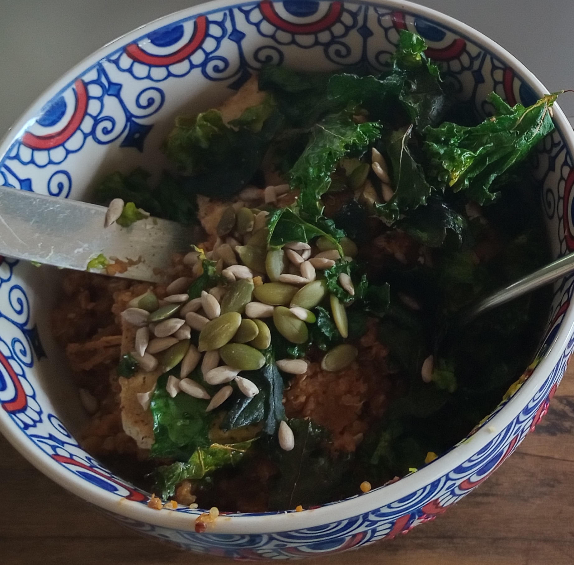 Korean kimchi, sweet potato, sesame seeds, garlic-tahini-lemon-gochugaru/paprika tofu/seitan