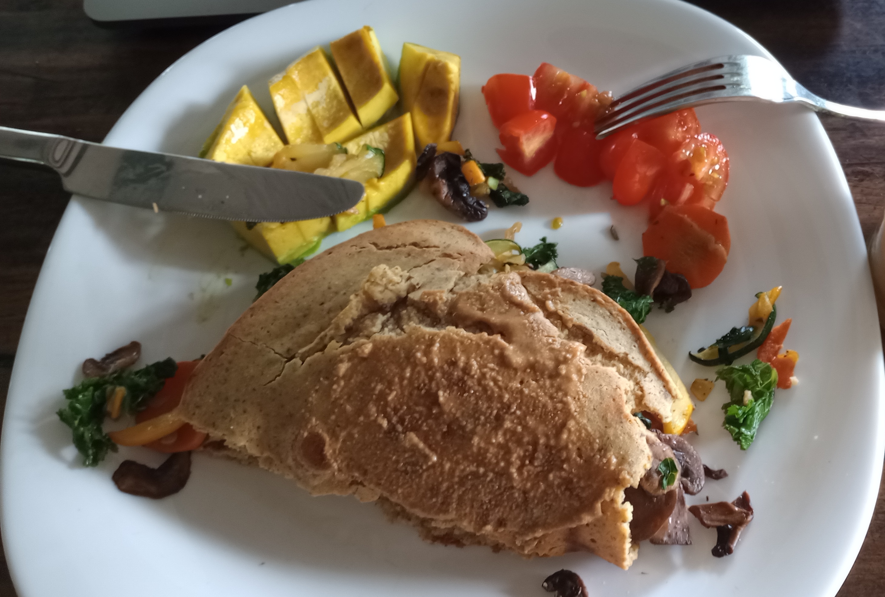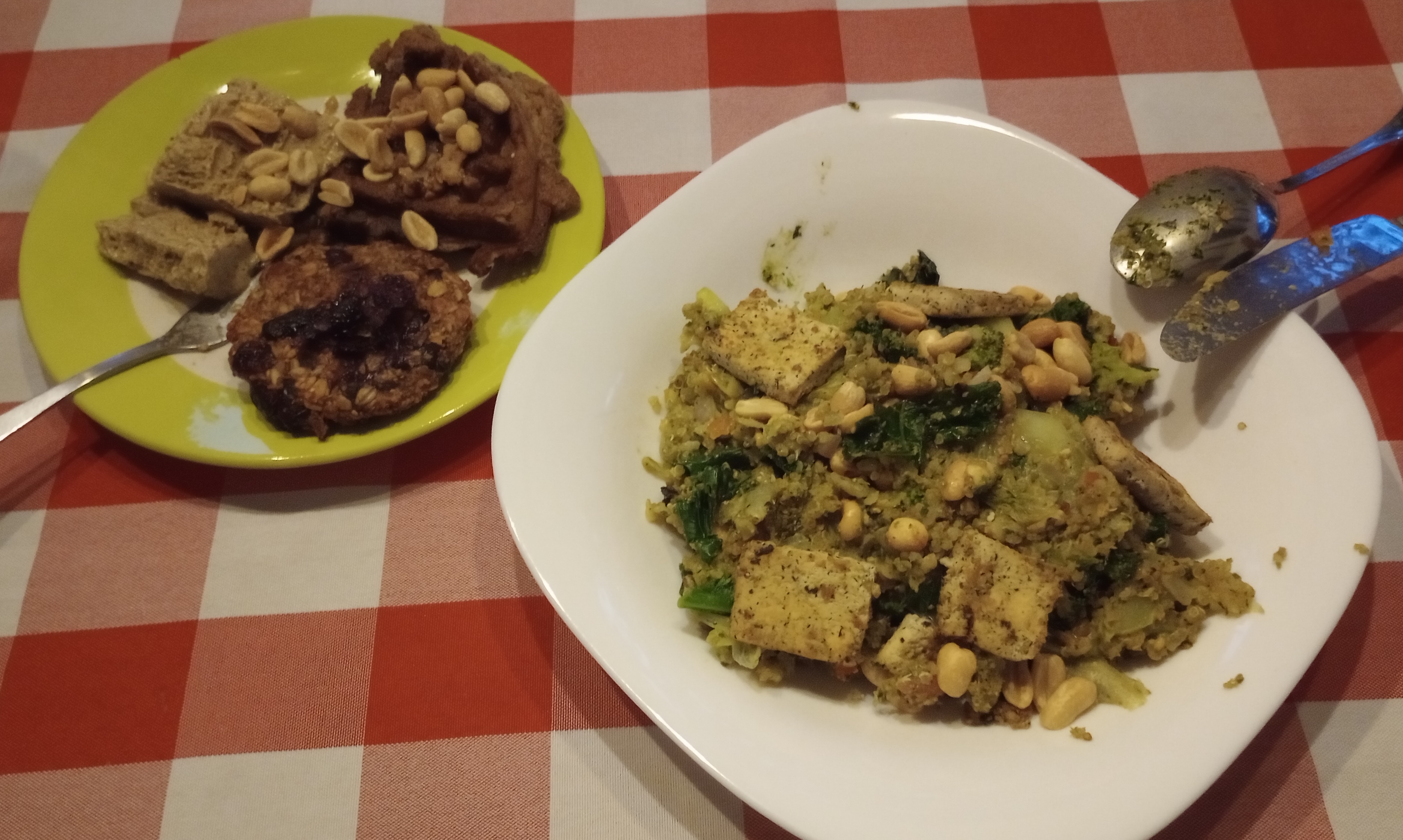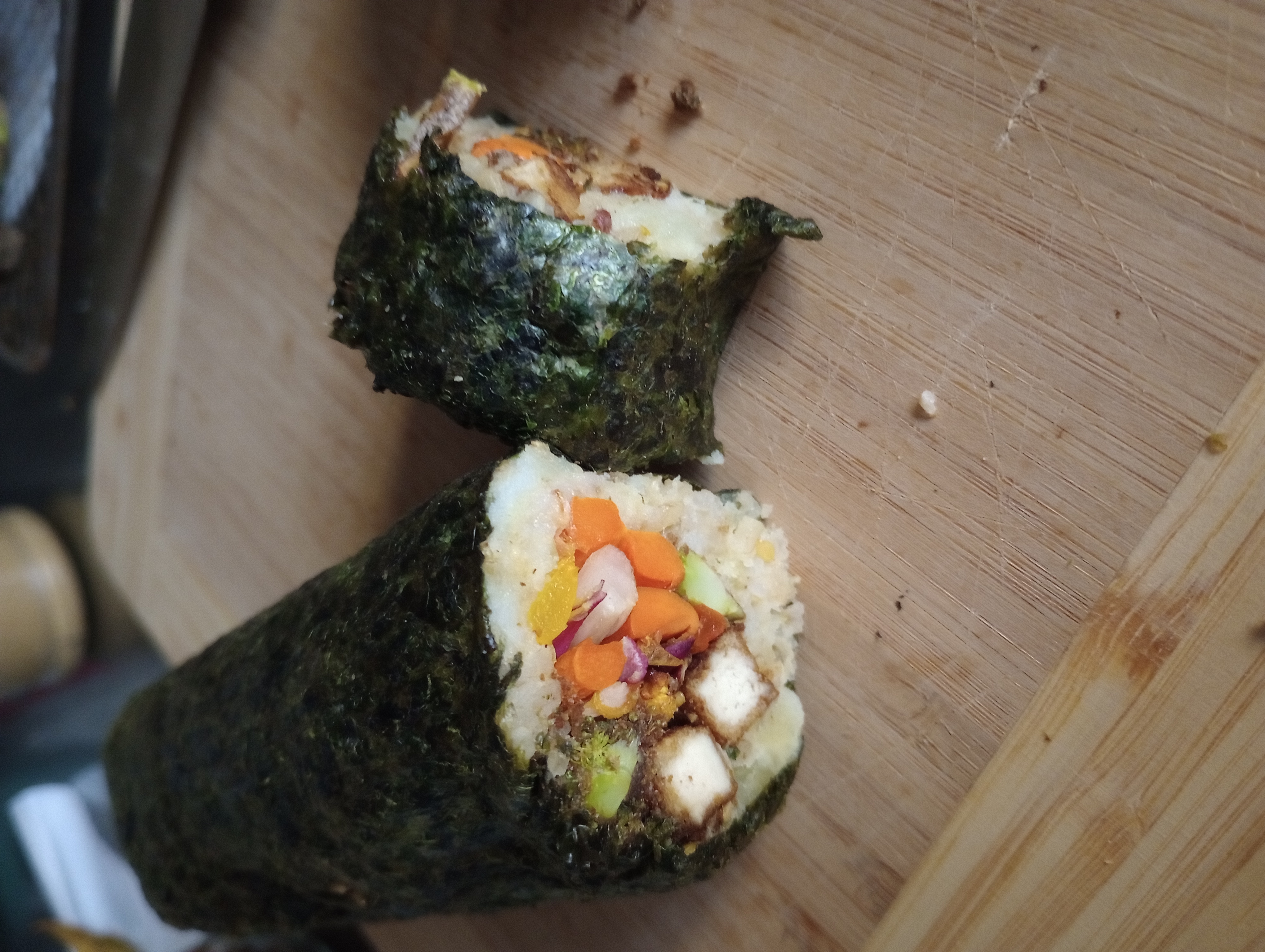 Korean kimchi, sweet potato, sesame seeds, garlic-tahini-lemon-gochugaru/paprika tofu/seitan