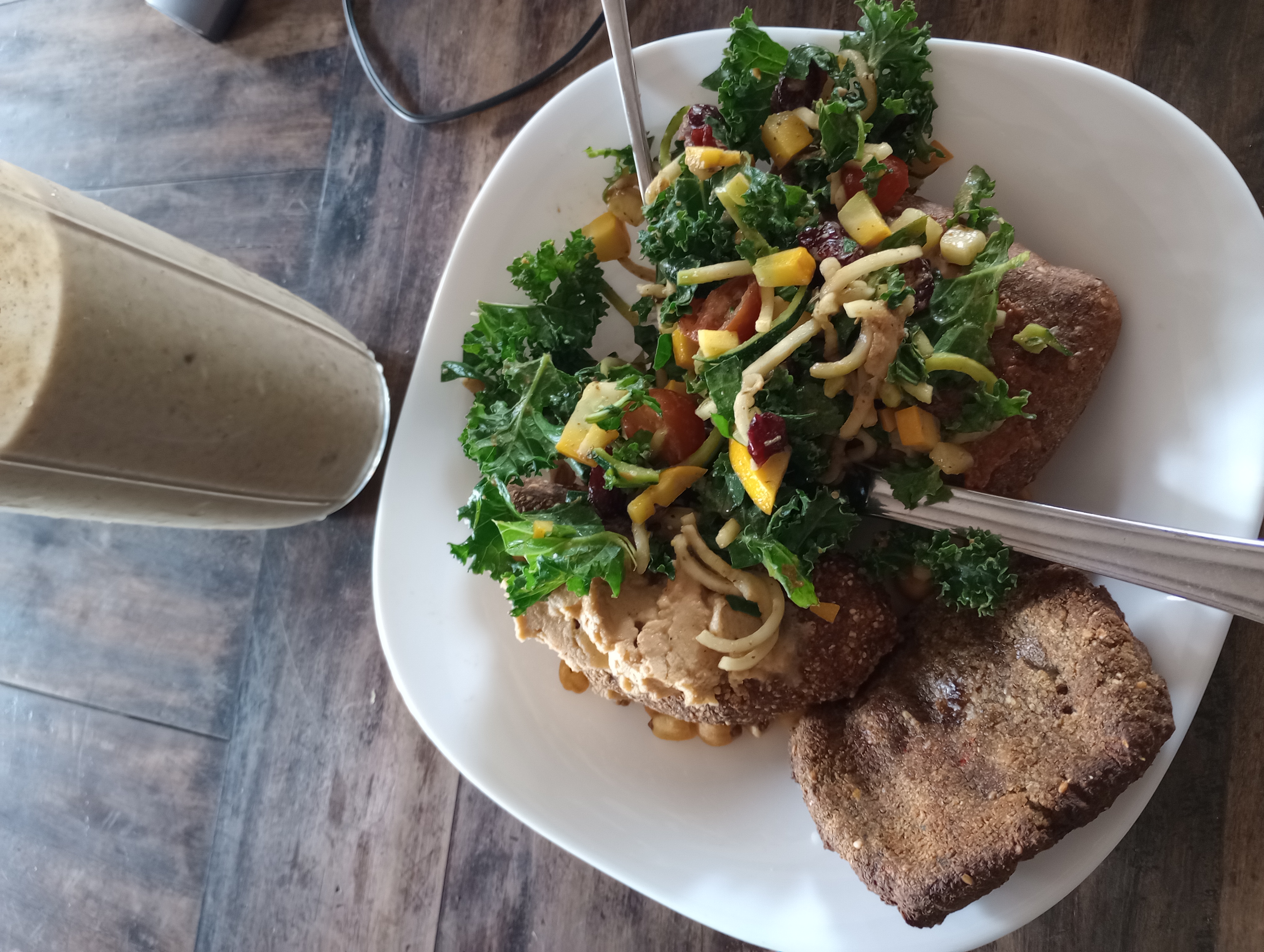 Apple/Pear/Peach, almond cheese, balsamic vinegar, date syrup, glazed tofu, arugula, kale, wheat croutons/groats