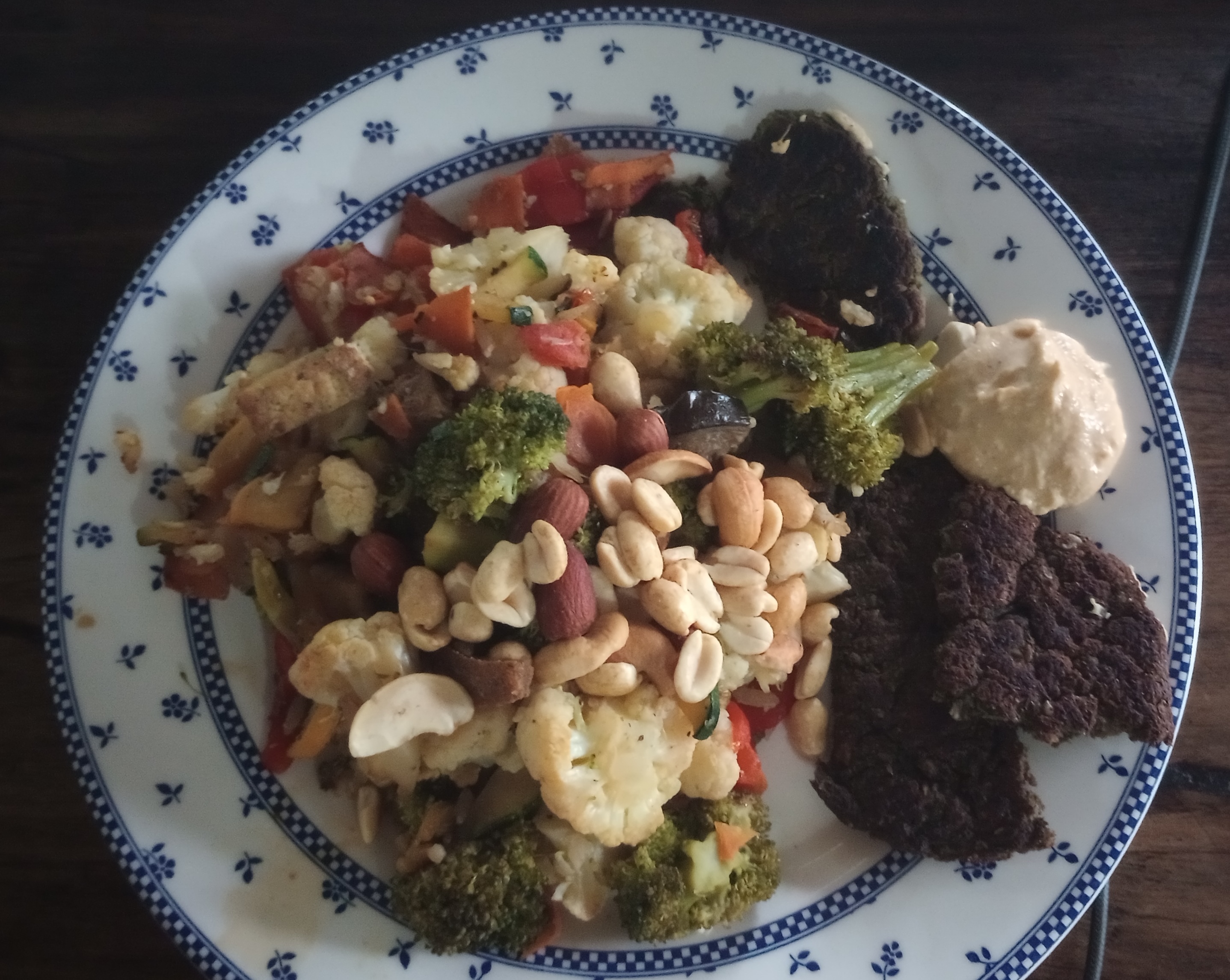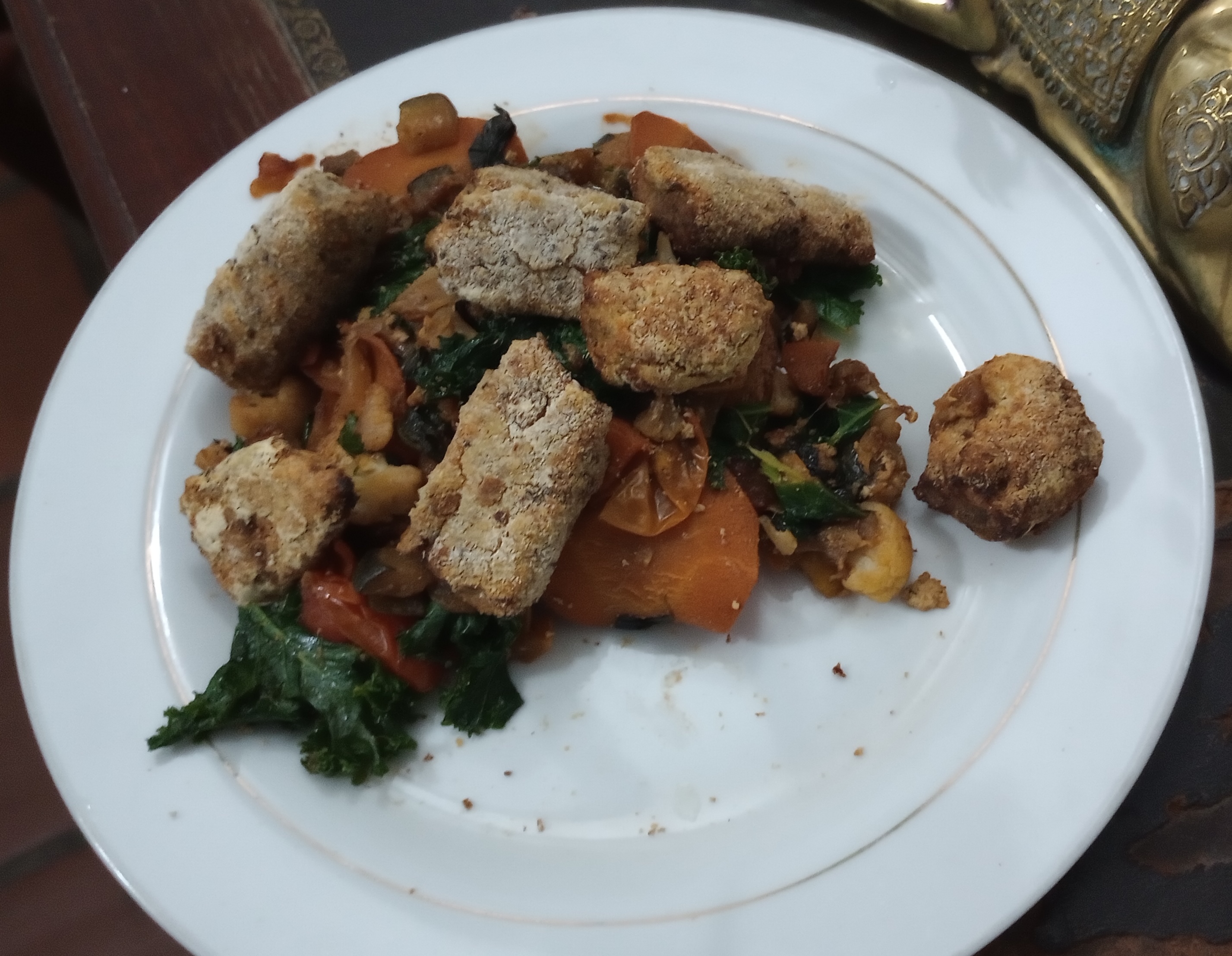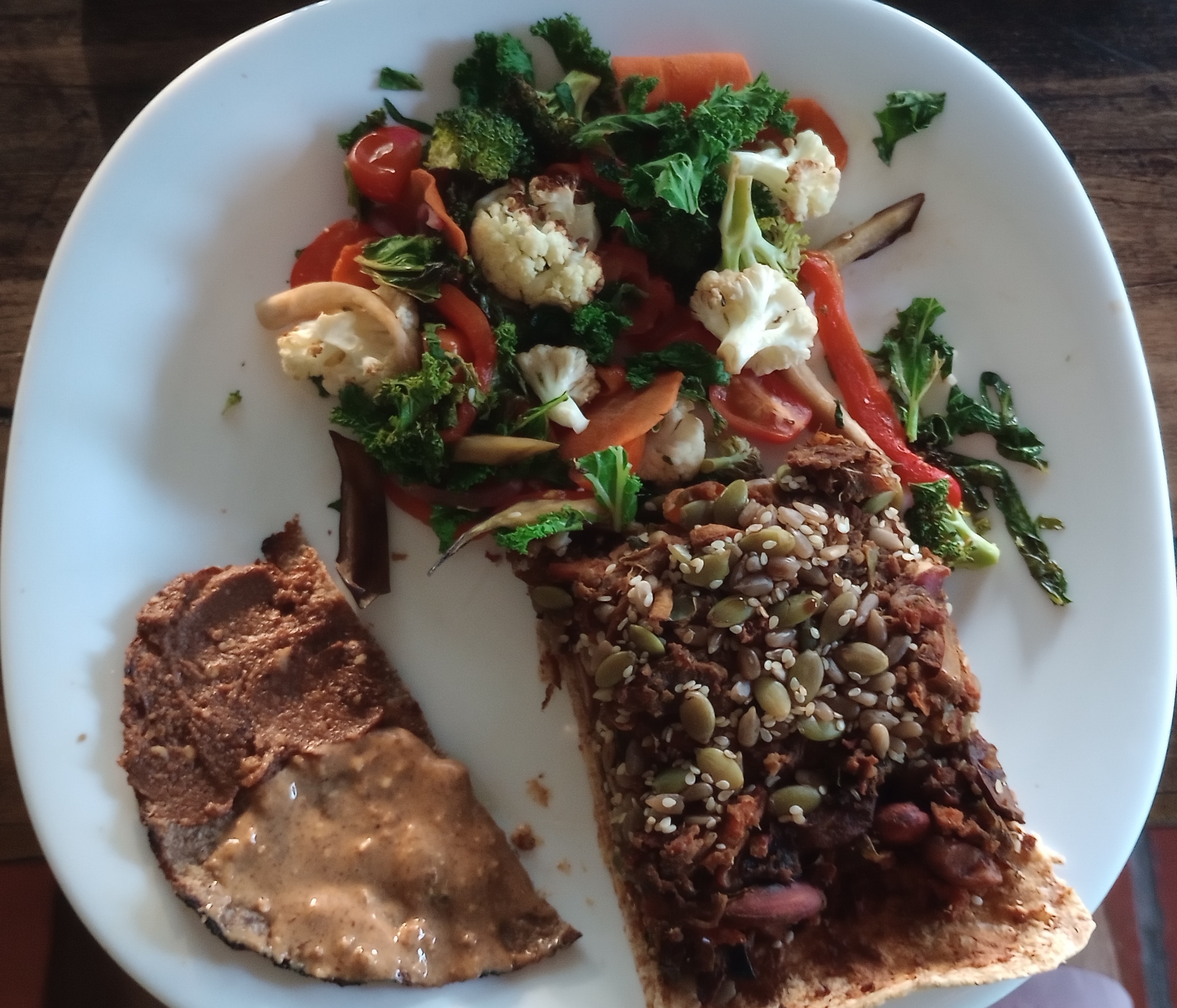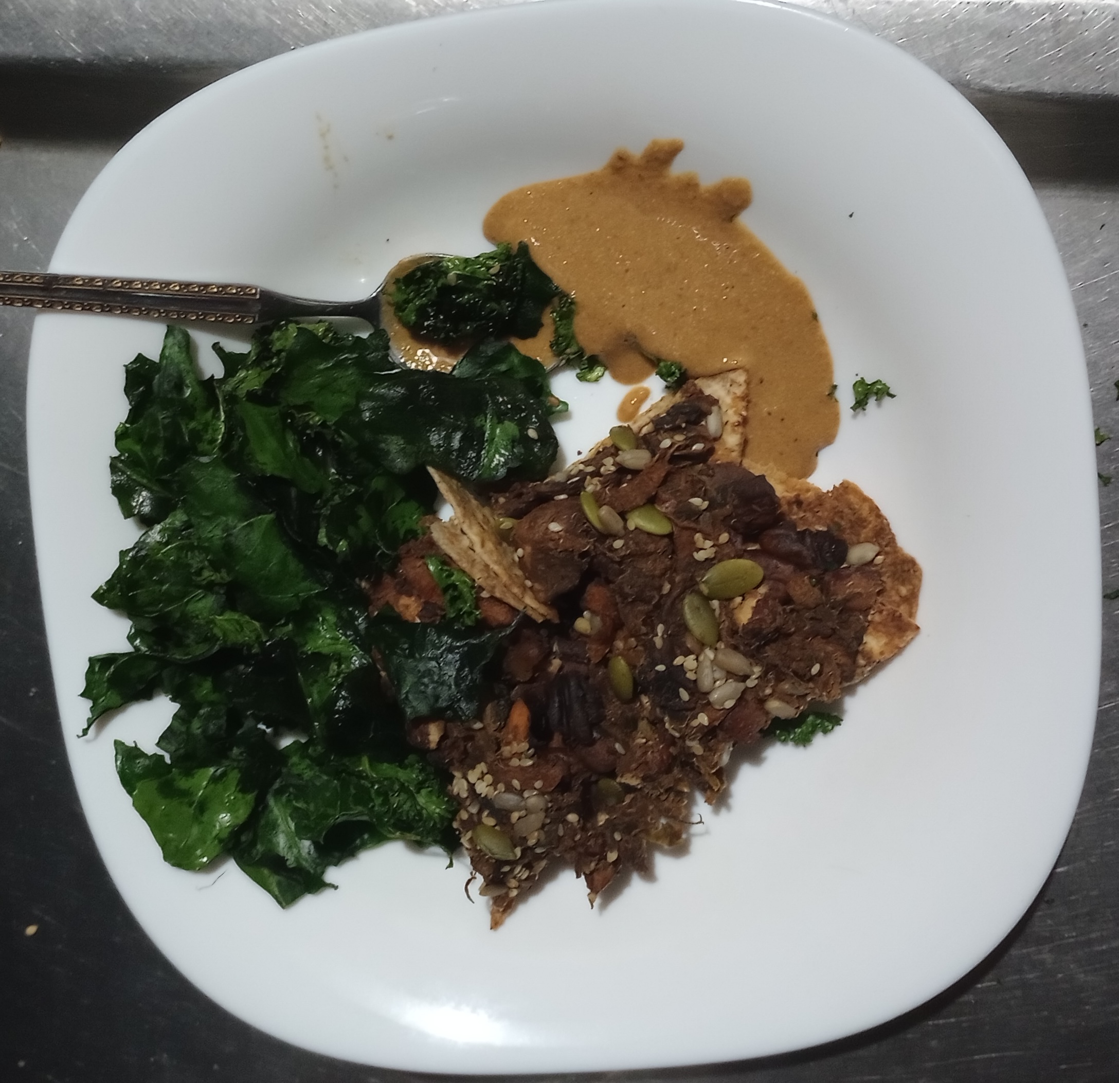 Korean kimchi, sweet potato, sesame seeds, garlic-tahini-lemon-gochugaru/paprika tofu/seitan