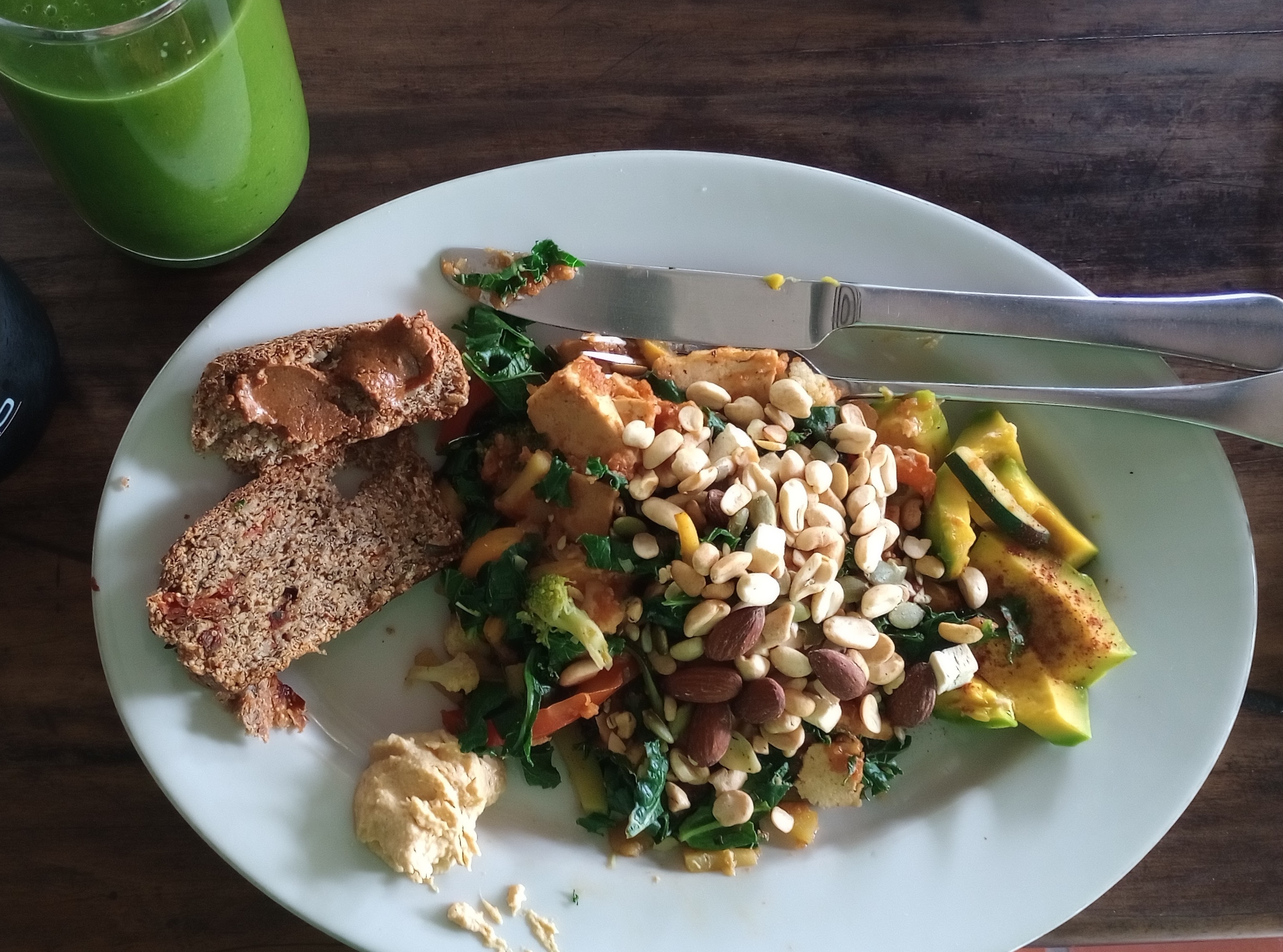 Apple/Pear/Peach, almond cheese, balsamic vinegar, date syrup, glazed tofu, arugula, kale, wheat croutons/groats