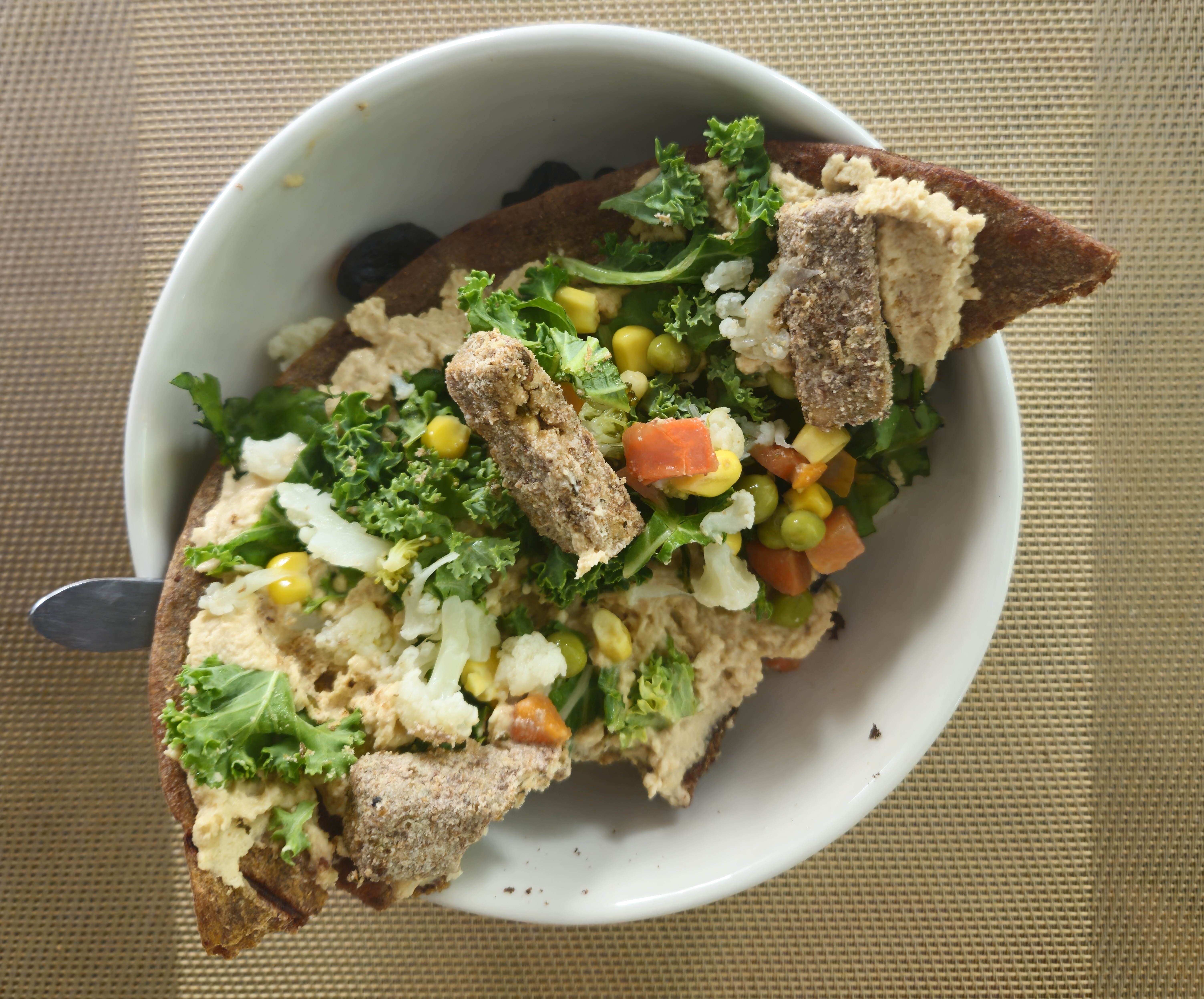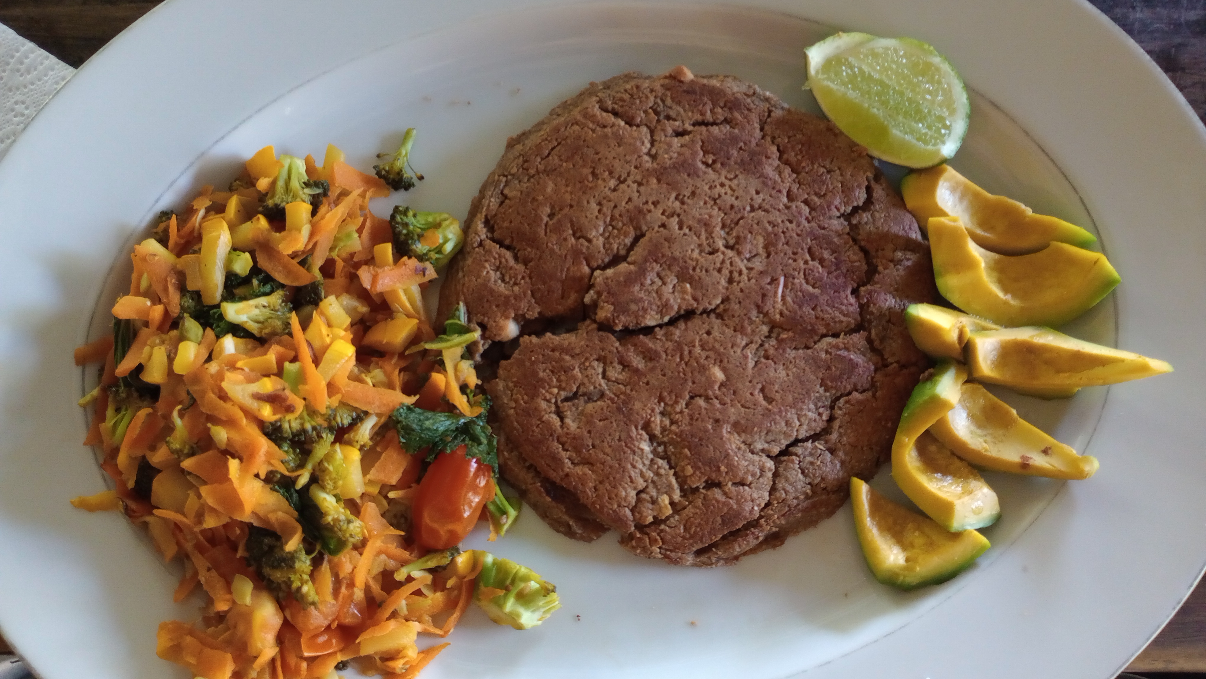 Mexican rice/corn, black beans, red onion, bell pepper, cilantro, parsley, lemon, avocado, cashew-nutritional yeast "cheese" or yogurt. As bowl or wrap